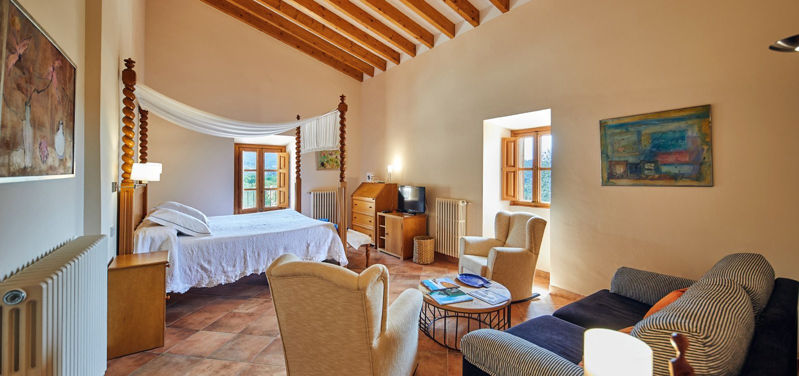 Our charming Junior Suites with terrace are spacious and bright, with a double bed or two single beds. We also offer the possibility of an extra bed upon request. Enjoy a cozy corner with a desk and sofa that can be converted into a bed in two of the three suites. Relax on the large private terrace with stunning views of the mountains or the bay of Palma de Mallorca. Tile floors and a marble bathroom complete the luxurious atmosphere. Discover the comfort of our Junior Suites, with 45 m2 of space!